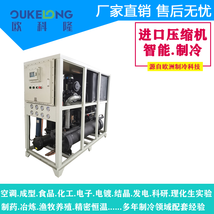 歐科隆40匹Ex防爆水冷箱式冷水機組是一款通過國家防爆認證(Ex dⅡB T4 Gb)的專業(yè)工業(yè)制冷設(shè)備,制冷量140kW,專為石油、化工、制藥等易燃易爆環(huán)境設(shè)計。機組采用正壓防爆箱體結(jié)構(gòu),關(guān)鍵防爆部件均符合ATEX標準。